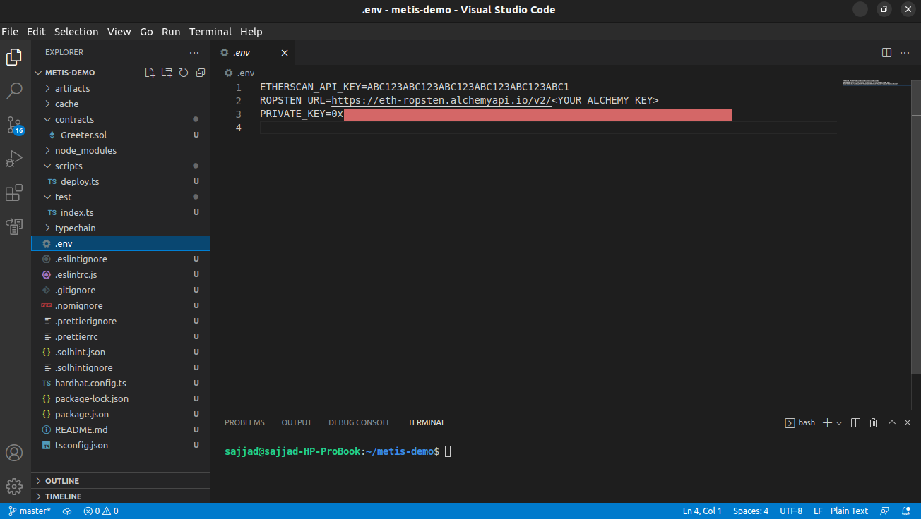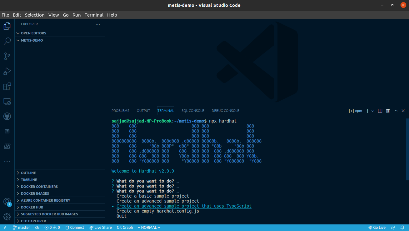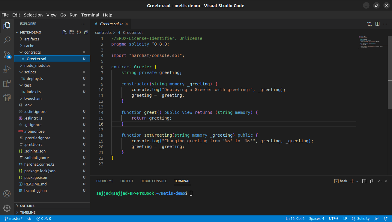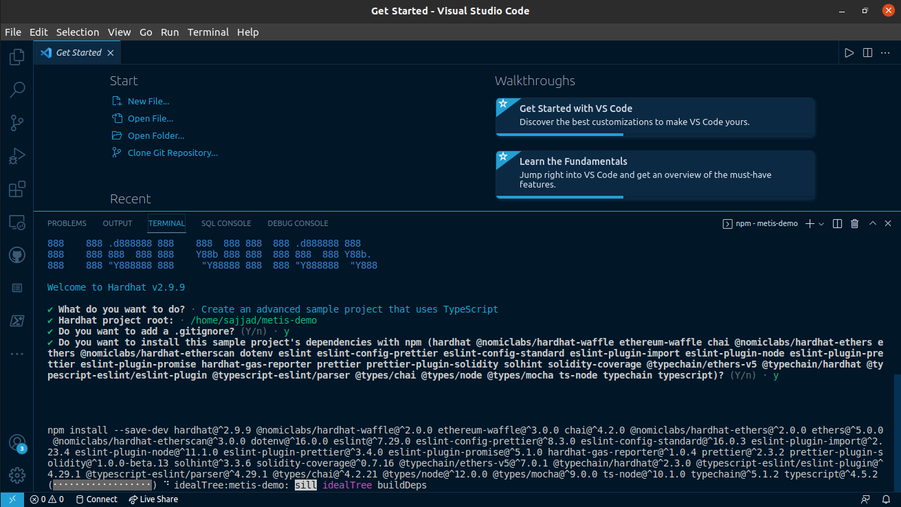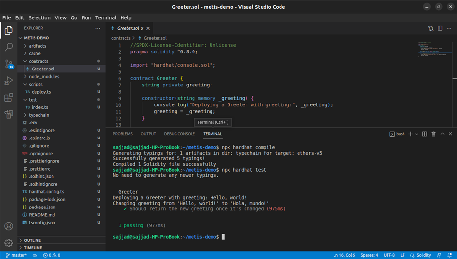 Here are the required steps for configuring Hardhat, creating a project, and compiling it to be deployed on the Metis platform. We configure Hardhat for Linux (Debian-based distros), but the procedure is the same for Windows and Mac.