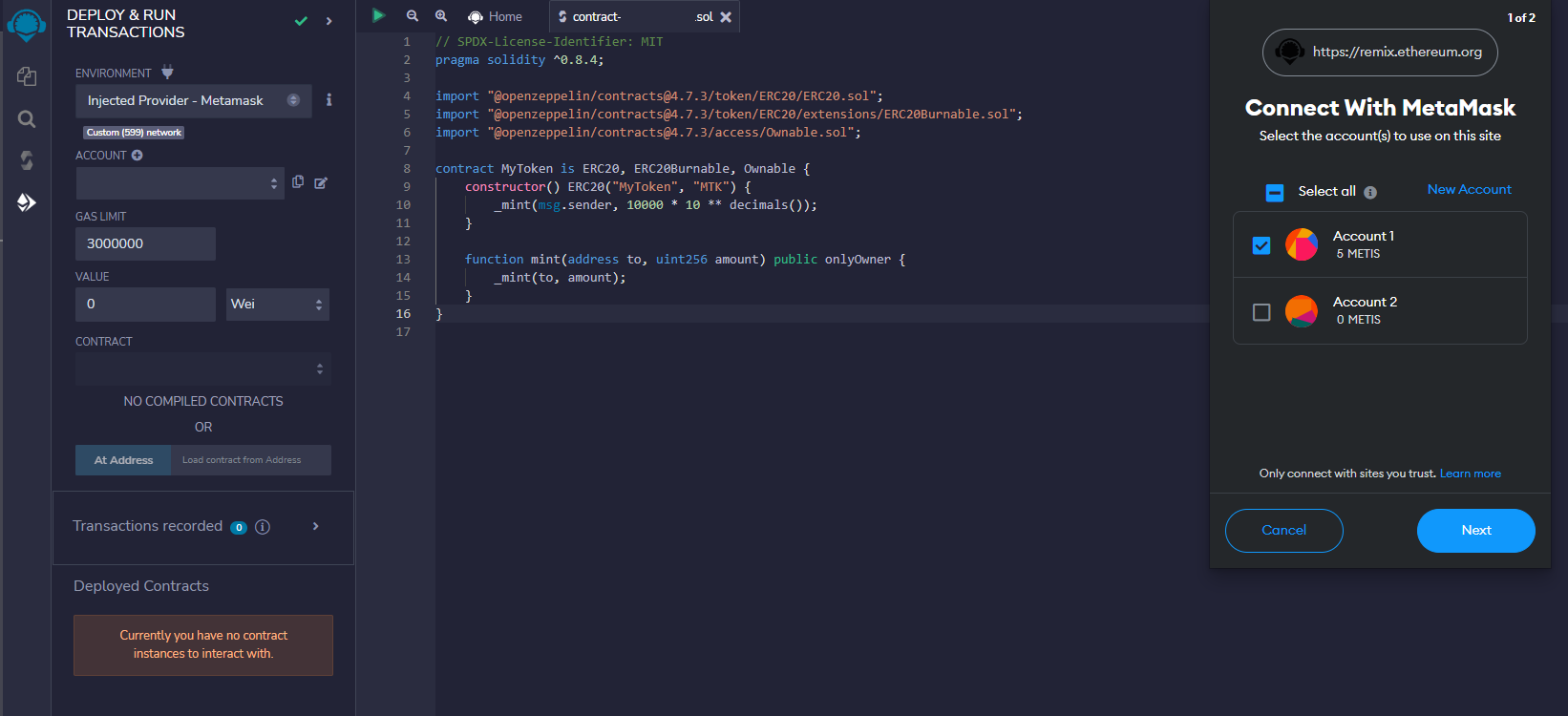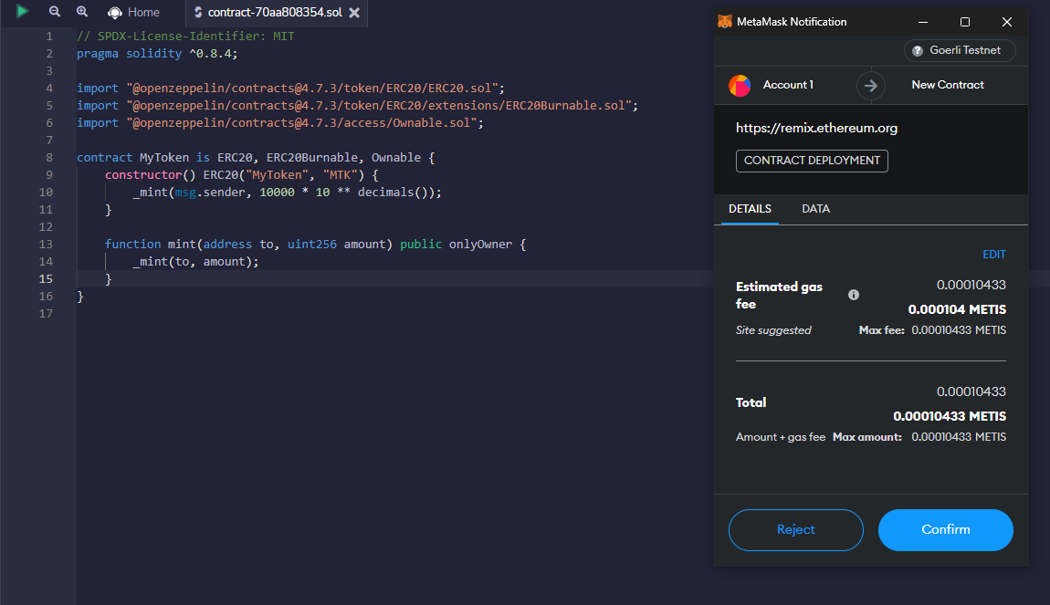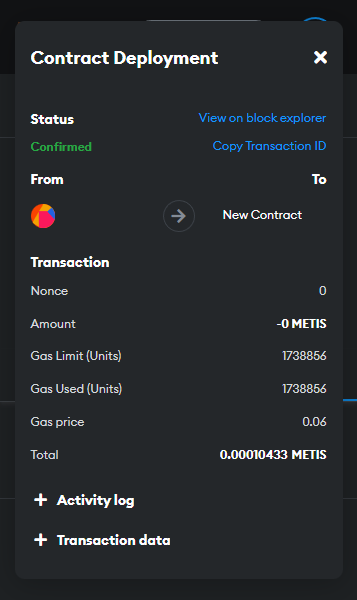 After doing all the settings, you can click on the “Deploy” button. Be careful your MetaMask network must be switched to the Metis Testnet, and you must have enough Metis tokens in your account.