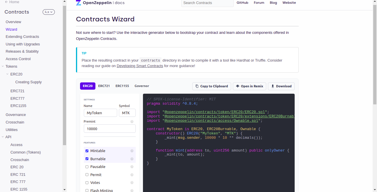 Go to the OpenZeppelin Contracts Wizard page to start the first project. You will have an interactive generator that offers simplicity to generating your desired code.