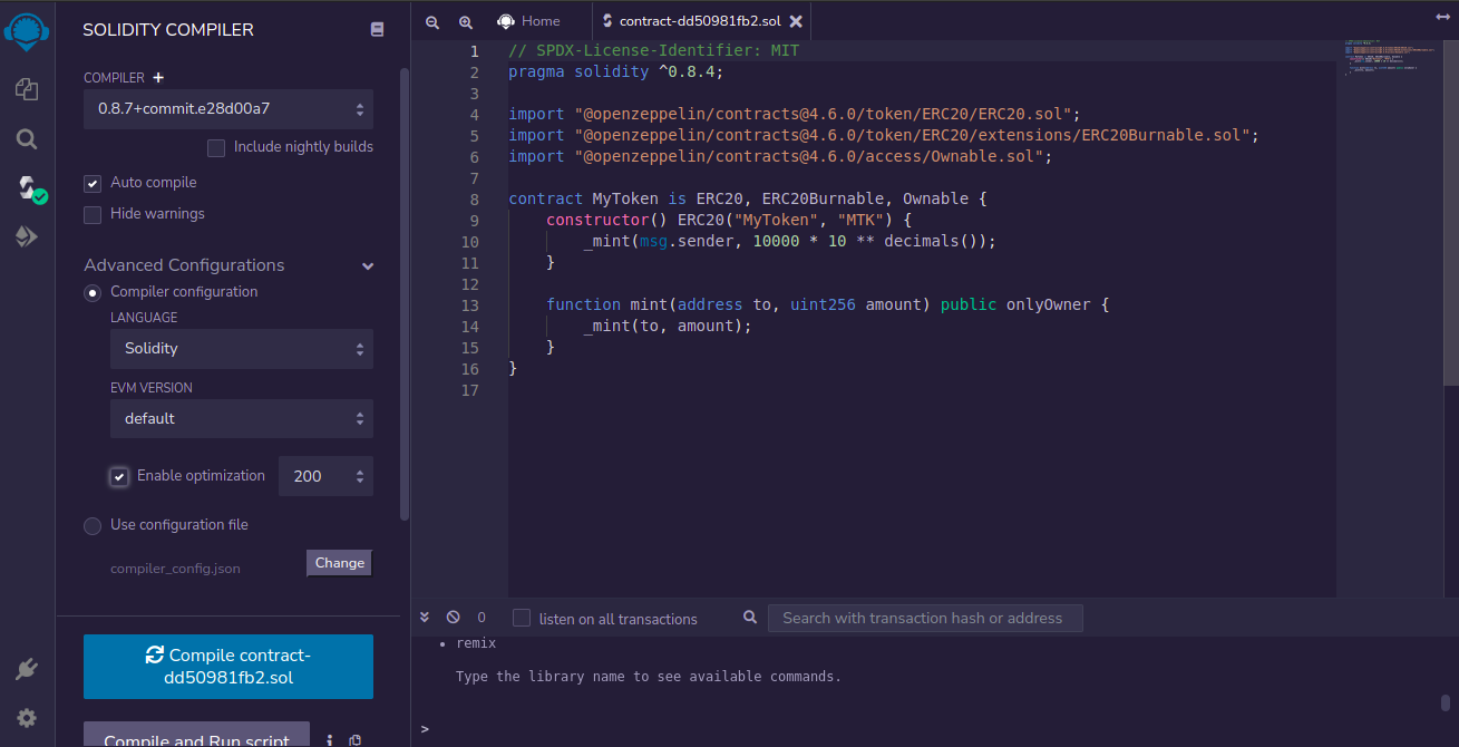 Once you click the compile button, it works on your code and shows a message indicating that the compilation process was successful. Note that you can select the Solidity compiler version and EVM version. We check the optimization option to have cheaper transactions.